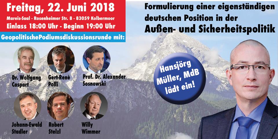 Hansjörg Müller, MdB, parlamentarischer Geschäftsführer der AfD-Fraktion im Deutschen Bundestag, Diplom-Volkswirt, lädt Sie herzlich zur Geopolitischen Podiumsdiskussion mit folgenden Teilnehmern ein: